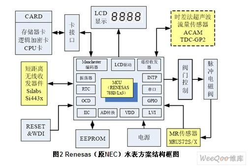 水表的電源一般由水表自行供給,這就對水表的功耗提出了苛刻的要求。國際規(guī)定,智能水表的靜態(tài)電流應該小于30μA,實際中水表廠商都把該指標控制在10μA以內(nèi)(使用干簧管傳感器時),保證工作時間大于6年以上才算合格。NEC帶LCD控制功能的8位微控制器以其低功耗、高性能等優(yōu)勢,成為水表微控制器的優(yōu)質(zhì)選擇。 1 NEC山梨MR和Renesas MCU水表方案 該方案的工作原理為:在葉輪上裝上磁鐵,由磁場感應器(MR Sensor)感知出葉輪的旋轉(zhuǎn)。磁場感應器(MR Sensor)把磁場信號轉(zhuǎn)變成電信號,再由單片機進行計量的加法或減法運算,運算值由液晶顯示或?qū)ν獠枯敵。如圖1所示